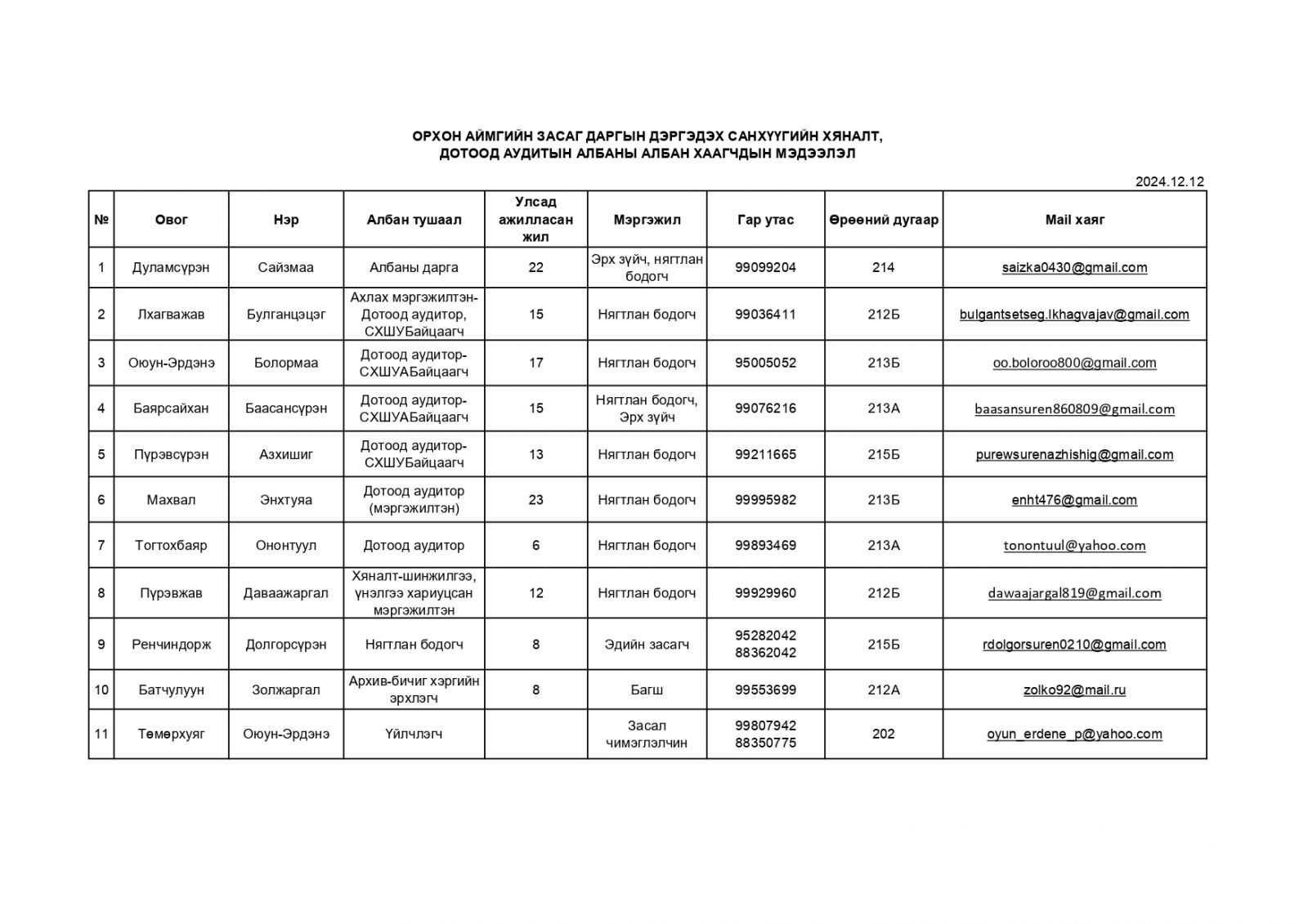 АЛТАН ТУШААЛТНЫ НЭР: АХЛАХ МЭРГЭЖИЛТЭН, ДОТООД АУДИТОР-САНХҮҮГИЙН ХЯНАЛТ ШАЛГАЛТЫН УЛСЫН БАЙЦААГЧ