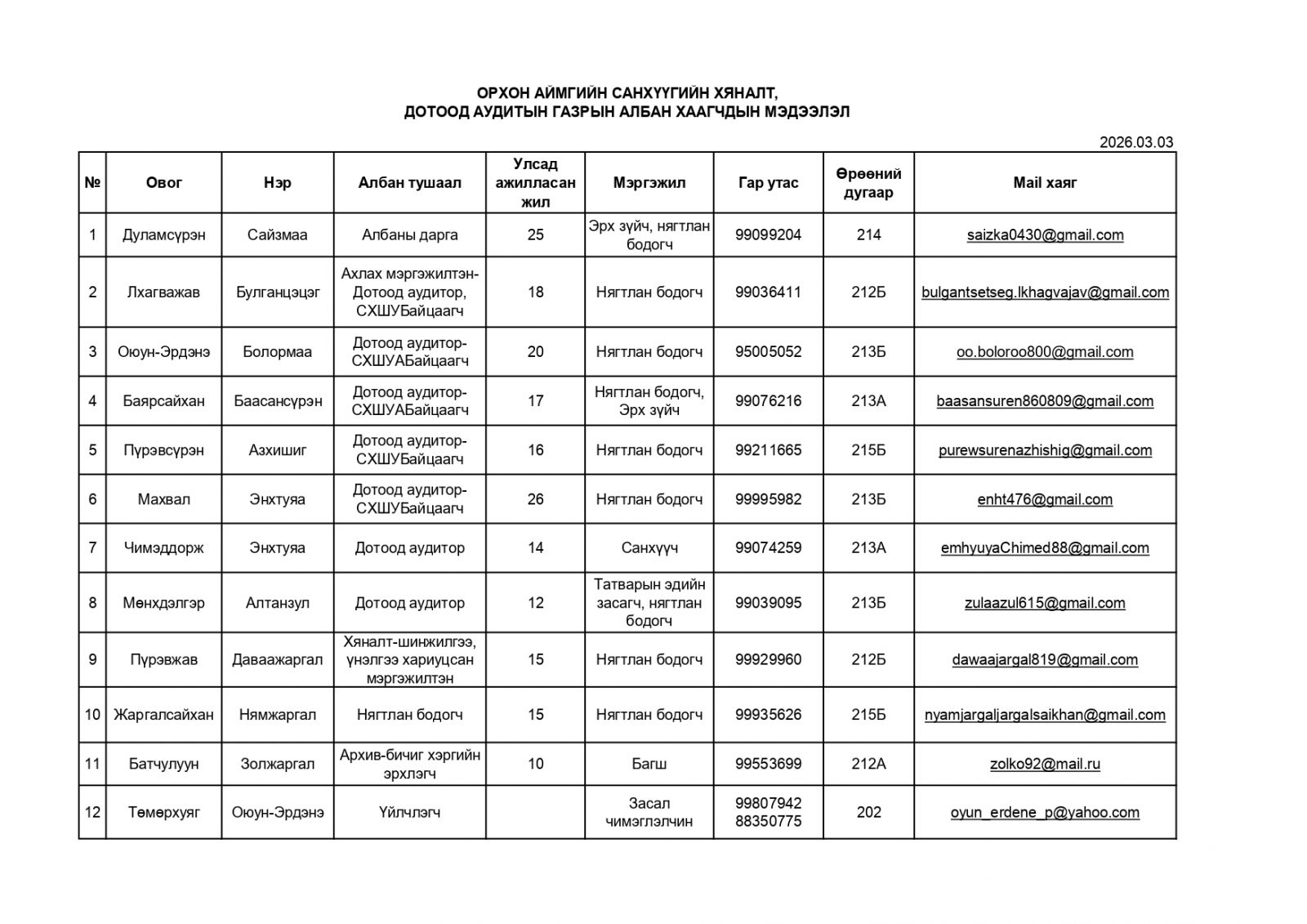 Байгууллагын нэр: Санхүүгийн хяналт,дотоод аудитын газар